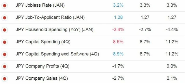 Analytici předpokládali, že míra nezaměstnanosti bude stagnovat na prosincových 3,3 %. Spotřeba domácností v lednu meziročně klesla o 3,4 %, čekalo se -2,7 % po prosincových -4,4 %. Kapitálové výdaje firem ve 4Q2015 vzrostly o 8,5 %, čekal se mírně lepší výsledek.