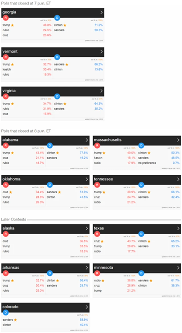 Volební superúterý v USA ovládli za demokraty Hillary Clintonová a za republikány Donald Trump. Oba vítězství brali v sedmi z jedenácti států. Republikán Ted Cruz uspěl ve dvou státech, Marco Rubio v jediném. Demokratický kandidát Bernie Sanders bodoval ve 4 státech.