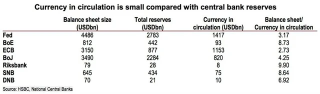 Centrální banky se snaží zaváděním záporných úrokových sazeb přimět banky k většímu úvěrování a lidi k vyšší spotřebě. Lidé by raději, než nechávat peníze s nízkými úroky na účtu, měli utrácet. Podle HSBC to má ale jeden velký háček - hotovosti není až tolik, kolik by se některým inženýrům spotřebitelských preferencí hodilo. Respektive tolik, aby bylo z bank možné vybrat tolik, aby to znamenalo výrazný problém pro celý sektor.