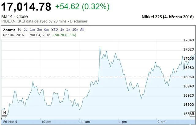 Japonský Nikkei 225 smazal předchozí ztráty a uzavřel se ziskem 0,32 % na 17 014,78 bodu. Za celý týden index zpevnil o 5,1 % a vrátil se nad 17tisícovou hranici.