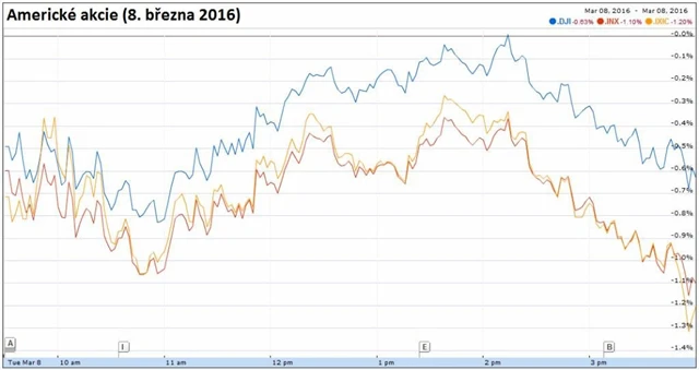 Spadla naopak cena akcií Citigroup (-3,66 %), a to poté, co její finanční ředitel John Gerspach řekl, že skupina očekává za první čtvrtletí letošního roku meziroční propad výnosů z aktivit investičního bankovnictví o 25 % a pokles výnosů z obchodování s pevně úročenými aktivy o 15 %. Gerspach se současně vyjádřil i k americkým úrokovým sazbám. Řekl, že Citigroup od Fedu stále čeká minimálně jedno zvýšení sazeb v letošním roce, a doplnil, že by byl velmi překvapený, pokud by centrální banka USA sazby místo zvýšení naopak srazila do záporu.