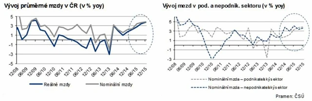 "Mzdy se v posledním loňském čtvrtletí vyvíjely pozitivně, což naznačuje, že příznivý ekonomický růst a pokles nezaměstnanosti se stále více promítají do mzdového vývoje a snahy firem udržet si nebo na pracovním trhu získat vhodnou pracovní sílu. Míra nezaměstnanosti se totiž již dostává k tak nízkým úrovním, že začíná být v některých oborech problém na trhu práce získat vhodné zaměstnance. To je patrné v dalším mírném zrychlování růstu mezd v podnikatelském sektoru (+3,9 % v 4Q2015 vs. +3,8 % v 3Q2015). Koncem roku byl však mzdový vývoj ovlivněn také zvýšením mezd státních zaměstnanců (+3,7 % v 4Q vs. +3,4 % v 3Q). Obecně tak byl za celý rok 2015 růst mezd ve veřejné sféře rychlejší než v soukromém sektoru (+3,5 % vs. +3,3 %), v letošním roce by se však měl tento vývoj obrátit," říká Jakub Seidler, hlavní ekonom ING pro ČR.