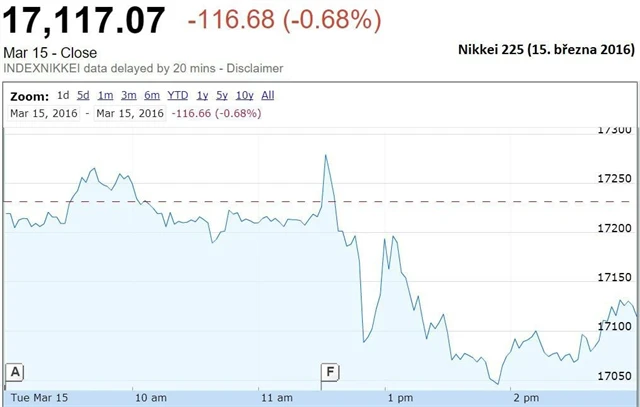 Japonský Nikkei 225 odepsal 0,68 % na 17 117,07 bodu poté, co během první poloviny obchodování kolísal mezi ziskem a ztrátou. Japonská centrální banka na svém úterním zasedání zhoršila výhled ekonomiky, měnovou politiku ale zatím nechala bez větších změn. Někteří analytici nicméně předpokládají, že slabá ekonomická aktivita a nízká inflace banku brzy přimějí, aby svá stimulační opatření znovu rozšířila.
