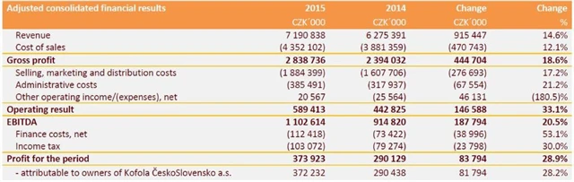 "Rok 2015 pro nás byl důležitý nejen kvůli IPO. Kofola dramaticky zvýšila svoji efektivitu a provedla úspěšné akviziční projekty. Dosáhli jsme rekordních výsledků, očištěný zisk se meziročně zvýšil o 29 % a dosáhl 373,9 milionu korun a výsledek na úrovni provozního zisku EBITDA přesáhl poprvé miliardu korun, když se meziročně zvýšil o 21 % na 1,1026 miliardy Kč," napsal ve výroční zprávě generální ředitel Kofoly ČeskoSlovensko Jannis Samaras.