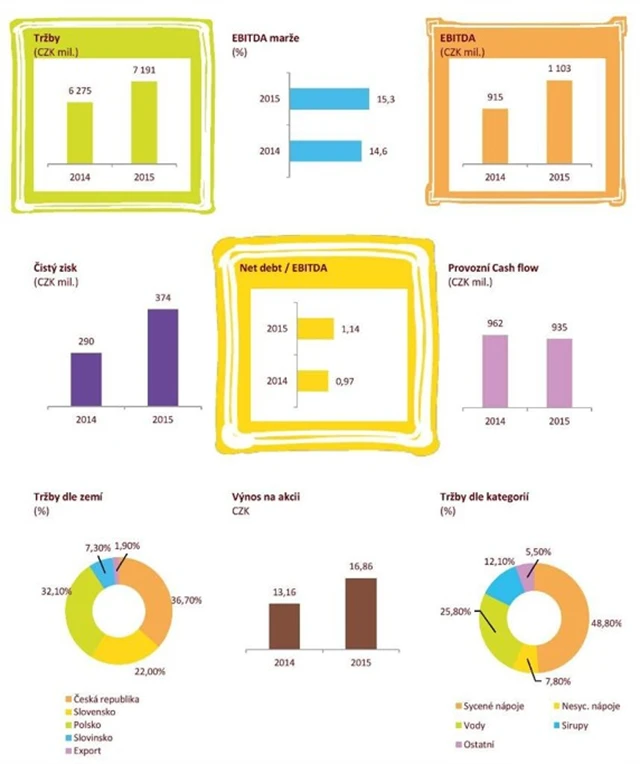 Očištěný provozní zisk se skupině zvýšil o třetinu na 589 milionů Kč a očištěný provozní zisk EBITDA (zisk před úroky, daněmi, odpisy a amortizací) stoupl o pětinu na 1,1 miliardy Kč. Výrazný nárůst loni zaznamenaly tržby z prodeje džusů UGO, které se zvýšily proti roku 2014 o 72 %.