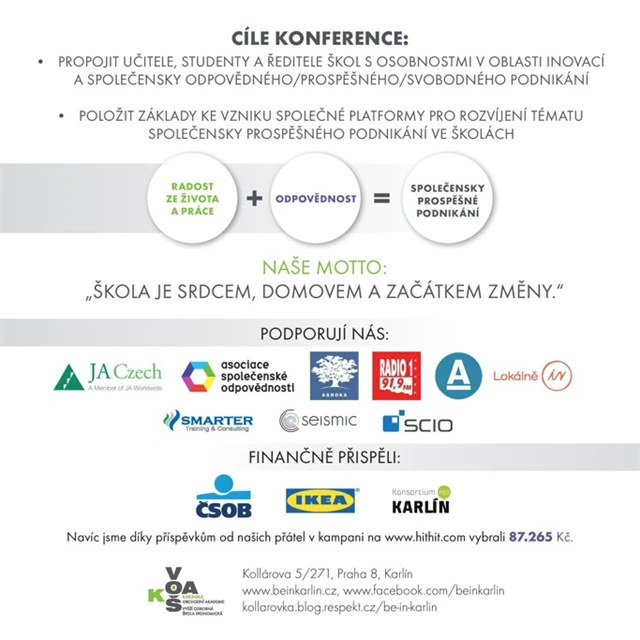 Proč: Cílem je propojit učitele, studenty a ředitele škol s osobnostmi v oblasti inovací a společensky odpovědného a prospěšného podnikání. Snahou je položit ve školách základy platformy pro rozvíjení tématu společensky prospěšného podnikání.