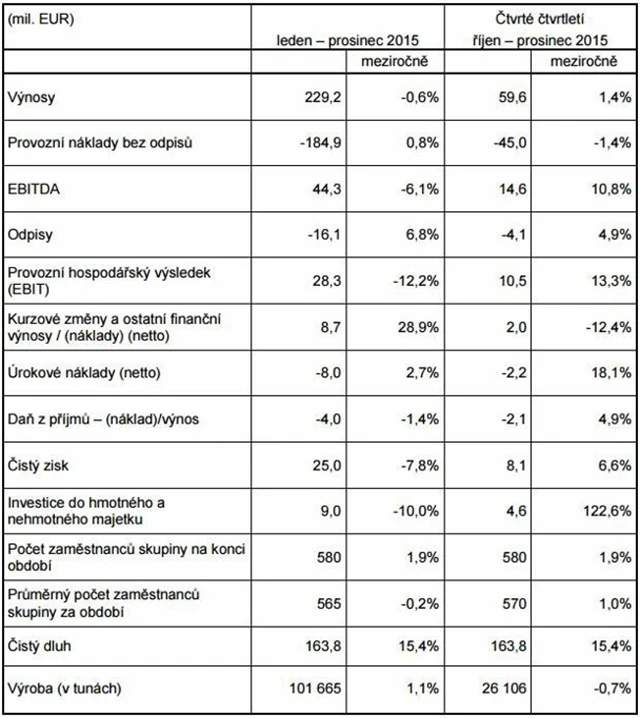 Výnosy z prodeje vlastních výrobků loni dosáhly 229,2 milionu eur, což je meziročně o 0,6 % méně. Ve čtvrtém čtvrtletí 2015 dosáhly výnosy 59,6 milionu eur, což představuje meziroční nárůst o 1,4 %. Stabilní úroveň výnosů vyplývá z meziročně nezměněné výrobní kapacity, která do značné míry předurčuje objem prodeje. Ten ve srovnávaných obdobích zůstal na přibližně stejné úrovni.