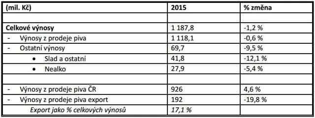 Celkové tržby z prodeje piva mírně klesly i přes nárůst celkových objemů prodeje a zdražení. Rozhodujícím faktorem byl podle skupiny pokračující přesun prodejů ze segmentu restauračních zařízení (on-trade) do segmentu řetězců (off-trade). Ostatní výnosy, které zahrnují výnosy z prodeje sladu a nealkoholických nápojů, klesly meziročně o 9,5 % na 69,7 milionu Kč.