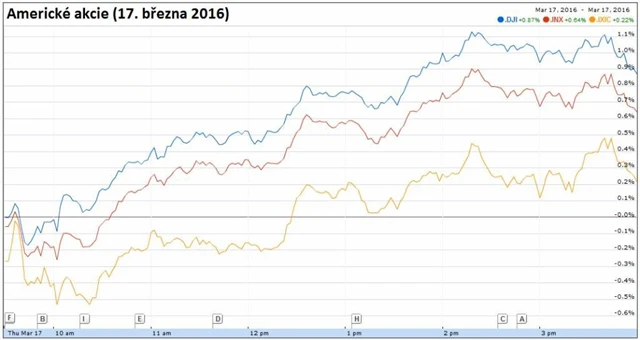 Americké akcie ve čtvrtek opět výrazně posílily a index Dow se od začátku letošního roku dostal do zisku. Náladu investorů nadále podporoval postoj Fedu, který ve středu večer naznačil, že zvyšování úrokových sazeb bude pomalejší, než se dosud čekalo. Rovněž dolar pod vlivem Fedu pokračoval v poklesu k euru.