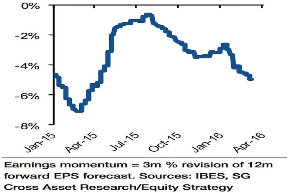 V níže uvedeném grafu od Société Générale je znázorněn trend ziskovosti společností na základě změn v očekáváních analytiků. "Při pohledu na jednotlivé sektory nejsou vyhlídky zrovna růžové," varuje banka ve zprávě klientům. "Od doby, kdy Alcoa odstartovala výsledkovou sezónu, konsenzus ohledně zisku na akcii (EPS) pro rok 2016 se snížil, a to nejen u sektorů navázaných na komodity, ale prakticky na celém trhu. Pouze v sektoru pojišťovnictví se letos očekává růst EPS. Všechny ostatní sektory zaznamenaly pokles v očekáváních ziskovosti. V lednu se v sektoru těžby ropy a zemního plynu očekával pokles EPS za rok 2016 o 4 %. O tři měsíce později se očekává 50% pokles," píše Société Générale.