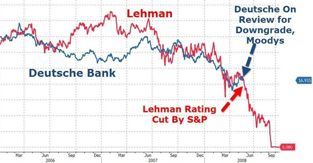 Deutsche Bank byla dána ratingovou společností Moody's do revize pro potenciální downgrade s odkazem na "exekuční rizika" jejího nového strategického plánu. Znepokojující na tom podle serveru Zero Hedge, který miluje konspirační teorie, je shodné načasování s událostmi kolem Lehman Brothers.