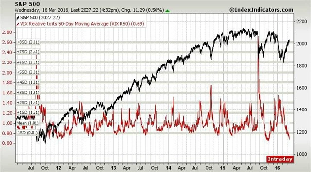 Podle Andrewa Trashera, portfoliomanažera z Financial Enhancement Group, jsou ve hře jen dva faktory, které mohou změnit současné neobvyklé postavení indexu VIX vzhledem k jeho 50dennímu klouzavému průměru – čas a cena. Buď se bude index pohybovat do strany až do té doby, než se k němu klouzavý průměr přiblíží, nebo budeme svědky rychlého pohybu indexu VIX nahoru, což bude ukazovat na rychlý nárůst volatility na trzích.