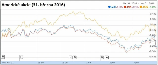 Americké akcie čtvrteční seanci zahájily kolem nuly a celý den se všechny tři hlavní indexy pohybovaly v úzkém pásmu. Dow a S&P 500 nakonec mírně klesly, ztráty byly ale spíše kosmetické. Za celý první kvartál Dow přidal procento a půl a S&P 500 zpevnil o necelé procento.