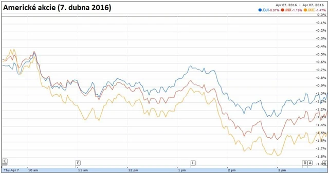 Dow klesl o 0,98 % na 17 541,96 bodu, širší S&P 500 odepsal 1,2 % na 2 041,91 bodu, a Nasdaq Composite spadl dokonce o 1,47 % na 4 848,37 bodu. Index volatility VIX vyskočil o 14,69 % na 16,16 bodu a výnos 10letých vládních dluhopisů USA se snížil téměř o sedm bazických bodů na 1,689 %.