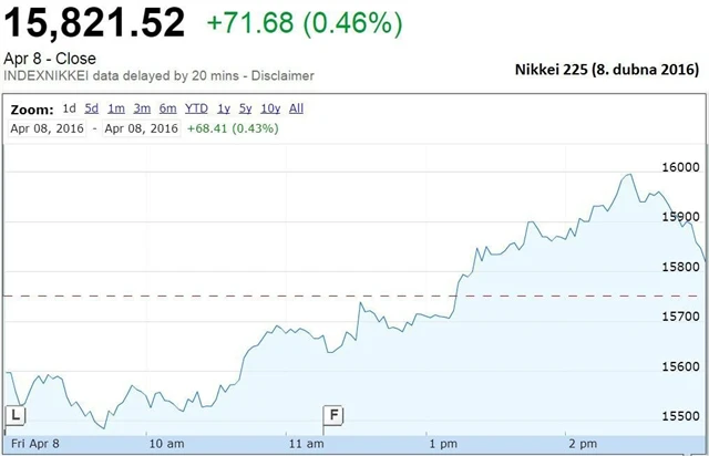 Japonský Nikkei 225 připsal 0,46 % na 15 821,52 bodu poté, co ministr financí Taró Asó prohlásil, že vláda je připravená provést nezbytné kroky k tomu, aby zastavila posilování jenu.