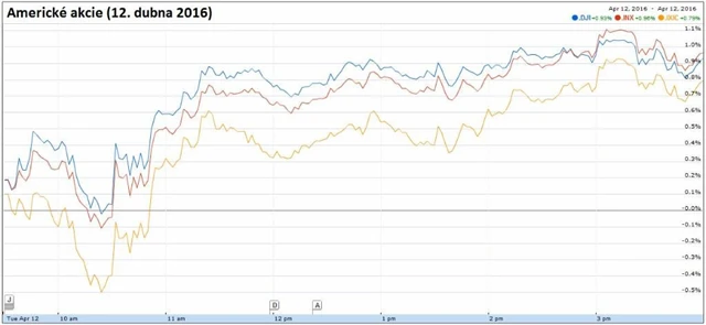 Akcie ve Spojených státech v úterý rostly a index Dow zažil nejlepší seanci za poslední měsíc. Nejlépe si vedly energetické firmy, kterým pomohl růst cen ropy. Akcie hliníkárenské firmy Alcoa, která v pondělí odstartovala výsledkovou sezónu za první kvartál, však klesly. Ceny ropy stouply nejvýše za čtyři měsíce a dostaly se na téměř 45 dolarů za barel.