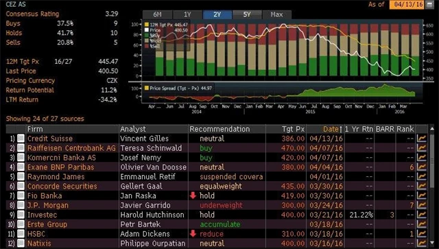 Analytici z Credit Suisse srazili cílovou cenu akcií energetické firmy ČEZ o 32 % na 386 korun. Důvodem je výrazně snížení jejich výhledu finančních výsledků firmy v důsledku dalšího poklesu cen elektřiny ve střední Evropě a očekávané vyšší depreciace a amortizace v důsledku vyšších kapitálových výdajů v předcházejících letech. Doporučení ale analytici ponechali na stupni "neutral".