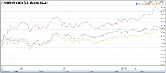 Akcie banky JPMorgan Chase (+4,23 %) přidaly přes čtyři procenta a byly nejvýkonnějším titulem v indexu Dow. Banka před začátkem obchodování oznámila, že v přepočtu na jednu akcii vydělala v letošním prvním čtvrtletí 1,35 USD při celkových výnosech 23,2 miliardy USD. Trh čekal zisk na akcii jen 1,26 USD. Celkové výnosy se bance meziročně snížily o 4 %, výnosy z investičního bankovnictví se ale propadly dokonce o 24 % na 1,23 miliardy USD. Situace v bankovním sektoru je podle agentury Reuters nyní celkově nejhorší od finanční krize z konce minulého desetiletí. Banky tíží důsledky propadu cen ropy a dalších komodit, útlum čínské ekonomiky, rostoucí náklady na splnění pravidel v rámci přísnější regulace a vysoké požadavky na kapitál. JPMorgan je první americkou bankou, která vydává čtvrtletní výsledky od prosincového rozhodnutí centrální banky (Fed) zvýšit poprvé za více než devět let úrokové sazby.