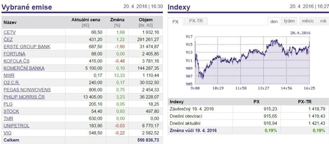 Index PX ve středu připsal 0,19 % na 916,94 bodu.