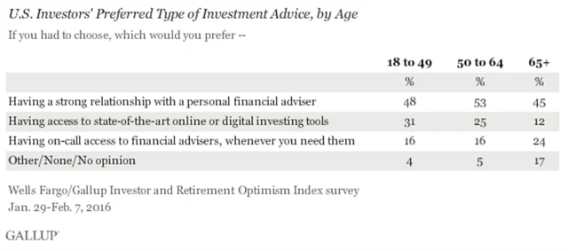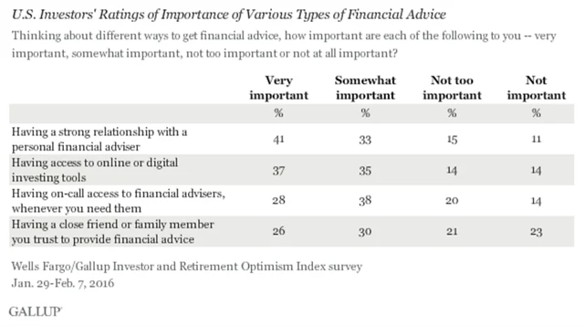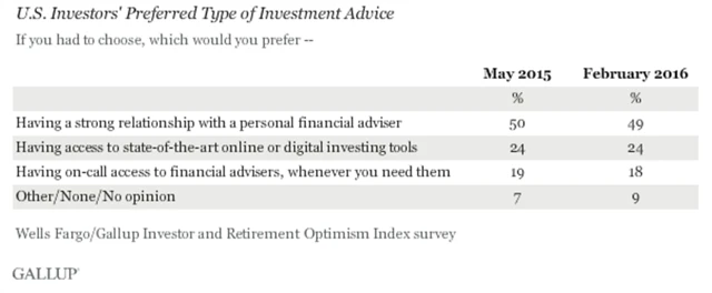 Digitální svět nabízí investorům analytické nástroje, informace v reálném čase a přístup ke službám 24 hodin denně. Nedávný průzkum Wells Fargo, Gallup Investor a Retirement Optimism Index ale nabídl zajímavé závěry. Američtí investoři zatím z digitální revoluce ve finančním poradenství nejsou zrovna "odvaření" a nové on-line nástroje nepovažují za plnohodnotnou náhradu tradičních finančních poradců z masa a kostí, s nimiž si mohou promluvit a budovat dlouhodobé vztahy.