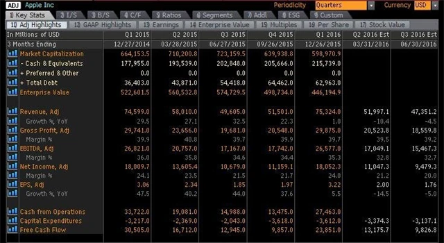 Analytici oslovení agenturou Bloomberg odhadují, že Apple za druhé finanční čtvrtletí vykáže upravený čistý zisk 11 miliard USD neboli dva dolary na akcii při tržbách 52 miliard USD. Tržby by se tak společnosti měly meziročně snížit o 10,4 %, a pokud se predikce naplní, půjde o první meziroční pokles tohoto ukazatele od roku 2003. Upravený zisk na akcii by se měl Applu snížit proti stejnému období předcházejícího roku dokonce o 14,5 %. Za období od října do prosince 2015 firma vykázala upravený zisk na akcii 3,22 USD (meziročně +5,5 %) a tržby 75,32 miliardy USD (meziročně +1 %).