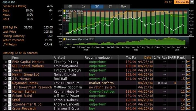 Akcie Applu aktuálně podle agentury Bloomberg pokrývá 50 analytiků, přičemž 44 jich doporučuje je kupovat, čtyři držet a dva prodávat. Průměrná cílová cena je 133,05 USD. Pondělní seanci titul zakončil na 105,08 USD, během příštích 12 měsíců tak podle analytiků nabízí potenciál zhruba 26% zhodnocení.