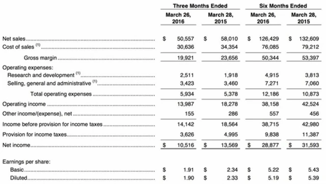 Meziročně se společnosti tržby snížily o 13 %, při vyloučení vlivu změn měnových kurzů by ale pokles byl jen 9%. Současně firma upozornila, že za první finanční pololetí (období leden-březen 2016 je pro Apple druhé finanční čtvrtletí) by se tržby při stálých kurzech měn o jedno procento zvýšily.