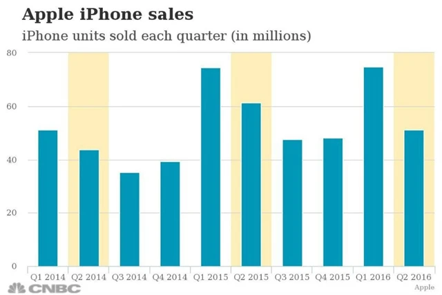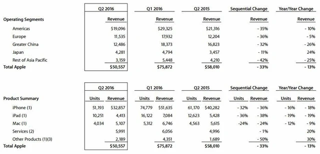 Znepokojující je především propad tržeb Applu v Číně o 26 % na 12,49 miliardy USD. Celkový počet prodaných iPhonů se meziročně snížil na 51,19 milionu kusů (tržby 32,86 miliardy USD) z 61,2 milionu kusů o rok dříve, počet prodaných tabletů iPad se snížil o 19 % na 10,25 milionů kusů (tržby 4,41 miliardy USD) a počet prodaných počítačů Mac klesl o 12 % na 4,03 milionu kusů (tržby 5,11 miliardy USD). Průměrná prodejní cena iPhonu se snížila na 641 USD, analytici čekali mírnější pokles na 658 USD.