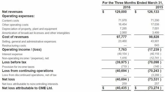 Celkové provozní náklady CME zůstaly při konstantních kurzech měn zhruba nezměněné (97,78 milionu USD proti 98,29 milionu USD v 1Q2015), když růst nákladů na mediální obsah byl kompenzován úsporami v jiných oblastech. Výrazný růst zaznamenaly úrokové náklady (nejsou součástí provozních nákladů), které se zvýšily meziročně na 49,15 milionu USD z 40,12 milionu USD (+22,5 %).