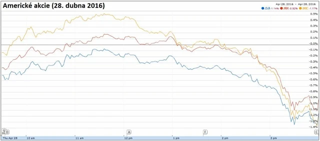 Americké akcie ve čtvrtek výrazně oslabily, srážela je zpráva o zpomalení hospodářského růstu ve Spojených státech. Náladu investorů zasáhlo rovněž rozhodnutí japonské centrální banky ponechat měnovou politiku beze změny. Ve zlevňování pokračovaly i akcie technologické společnosti Apple poté, co investor Carl Icahn oznámil, že se zcela zbavil svého podílu ve firmě.