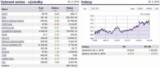 Index pražské burzy PX během pátečního obchodování vystoupal o více než pět bodů a uzavřel na 916,04 bodu (+0,77 %). Vzestup vedly tituly ČEZ, Pegas Nonwovens, Unipetrol a Philip Morris ČR, nejvíce ztratily CME a Fortuna. Za celý týden index PX odepsal 0,28 %.