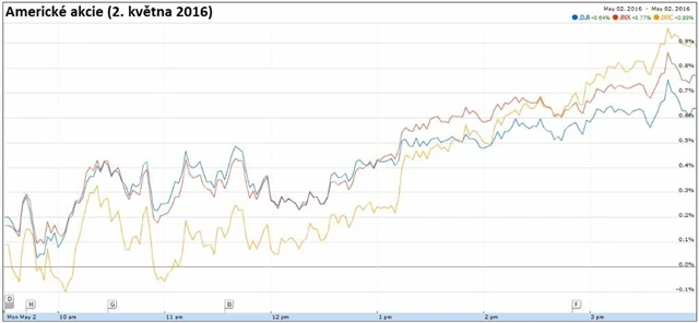 Dow posílil o 0,66 % na 17 891,16 bodu, širší S&P 500 přidal 0,78 % na 2 081,43 bodu a Nasdaq Composite uzavřel se ziskem 0,88 % na 4 817,59 bodu. Index volatility VIX klesl o 6,5 % na 14,68 bodu a výnos 10letých vládních dluhopisů USA se zvýšil o tři bazické body na 1,865 %.