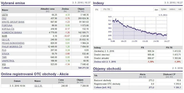 Většina titulů byla v mínusu. Světlými výjimkami byly CME (+4,33 %), Philip Morris ČR (+1,20 %) nebo O2 Czech Republic (+0,63 %).