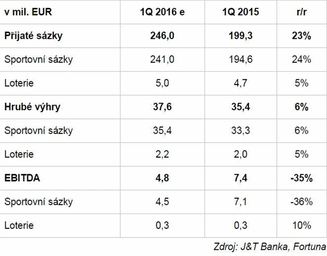 "Předpokládáme meziroční růst objemu přijatých sázek o 23 %. Méně pozitivní vývoj očekáváme u hrubých marží, kde by mělo dojít k poklesu na 15,3 % ze 17,7 % v 1Q2015), růst hrubých výher by tak měl být výrazně pomalejší (čekáme +6 % meziročně) než růst objemu přijatých sázek," říká analytik Milan Lávička z J&T Banky.