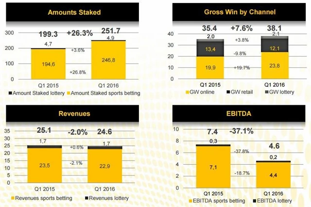 Meziroční srovnání objemu hrubých výher, který se v prvním čtvrtletí zvýšil o 7,6 % na 38,1 milionu eur, je ovlivněno zrušením manipulačního poplatku u internetového sázení na Slovensku na konci února 2015, jež kromě samotného výpadku poplatku vedlo rovněž ke zrychlenému přechodu části hráčů z poboček k on-line sázení.