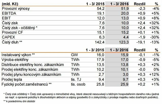 "Skupina ČEZ dokázala v prvním čtvrtletí 2016 vygenerovat 15,1 miliardy Kč provozního cash flow a snížit čistý dluh o 7,9 miliardy Kč," doplnil místopředseda představenstva a finanční ředitel ČEZ Martin Novák.