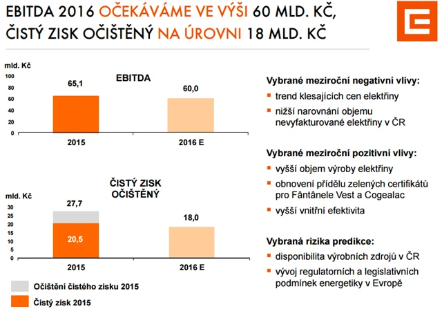 S ohledem na snížení očekávaného objemu výroby a pokračující nepříznivé podmínky pro podnikání v evropské energetice ponechala skupina ČEZ výhled provozního zisku před odpisy (EBITDA) pro celý rok 2016 na úrovni 60 miliard Kč a očekávaný upravený čistý zisk na úrovni 18 miliard Kč.