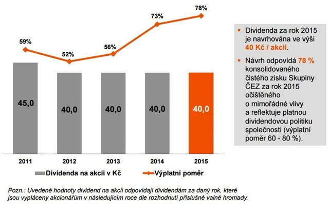 Na konci dubna představenstvo společnosti navrhlo vyplatit stejně jako v předcházejících třech letech dividendu z loňského zisku 40 Kč na akcii před zdaněním. Pokud valná hromada ČEZ návrh schválí, bude mezi akcionáře rozděleno celkem 21,4 miliardy Kč a stát jako majoritní akcionář získá 15 miliard korun. Valná hromada ČEZ se bude konat 3. června.