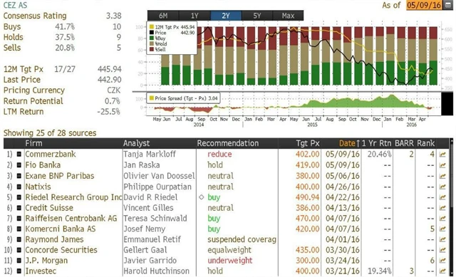 Podle agentury Bloomberg aktuálně akcie ČEZ pokrývá 24 analytiků, z nichž 10 jich doporučuje titul kupovat, devět držet a pět prodávat. Průměrná cílová cena je 445,94 Kč, aktuálně se titul obchoduje mezi 440 a 460 korunami. Česká spořitelna akcie ČEZ doporučuje akumulovat, cílovou cenu má v revizi.
