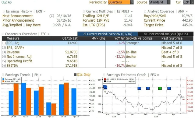 "Ve světle silných výsledků hospodaření v 1Q2016 by naše únorové prognózy stále mohly být dosažitelné (tehdy jsme čekali EBITDA 61,4 miliardy Kč a upravený čistý zisk 18,6 miliardy Kč za rok 2016)," myslí si analytik Josef Němý z Komerční banky. "Cena akcií ČEZ je momentálně více než 20 % nad svým únorovým dnem a přesáhla již naši cílovou cenu. Celkový očekávaný výnos (včetně dividendy) se tak značně zmenšil, a proto bychom mohli snížit doporučení (zatím koupit ze 12. února). K aktualizaci analýzy ale přistoupíme nejdříve na začátku června, kdy bude zveřejněna nová prognóza Société Générale pro ceny německé elektřiny. Hlavními riziky pro cenu akcií ČEZ jsou nadále nižší než očekávané ceny elektřiny, vyšší než očekávané investice a méně štědrá dividendová politika."