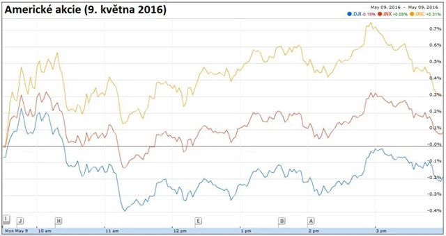 Akcie ve Spojených státech uzavřely úvodní seanci druhého květnového týdne smíšeně, pohyby hlavních indexů ale nebyly výrazné. Index Dow dolů stáhl pokles ceny akcií energetických firem a cenných papírů producentů surovin. Světové ceny ropy přišly o počáteční zisky, jimiž reagovaly na pokračující obří požár kolem nalezišť ropných písků v kanadské provincii Alberta, a nakonec klesly.