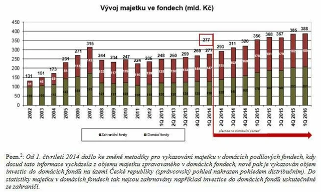 Nejvíce peněz je v dluhopisových (113,7 miliardy Kč) a smíšených fondech (137,9 miliardy Kč). Hodnota majetku v zahraničních fondech klesla od počátku roku o 1,52 miliardy Kč na 180,3 miliardy Kč, domácí fondy vykázaly růst o 4,2 Kč miliardy Kč na 207,7 miliard Kč.