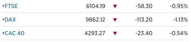 Celoevropský index STOXX Europe 600 odepsal zhruba 0,5 %. Podobně si vedly i velké indexy burz v Londýně (FTSE 100 -0,95 %), Frankfurtu (DAX -1,03 %) a Paříži (CAC 40 -0,54 %).