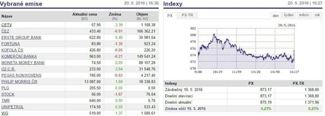 Index pražské burzy PX si v pátek připsal 0,23 % a uzavřel na hladině 875,19 bodu. Nejúspěšnějším titulem byla v závěru týdne mediální společnost CME (+3,39 %), naopak nejvíce zlevnily akcie likérky Stock Spirits (-1,67 %).