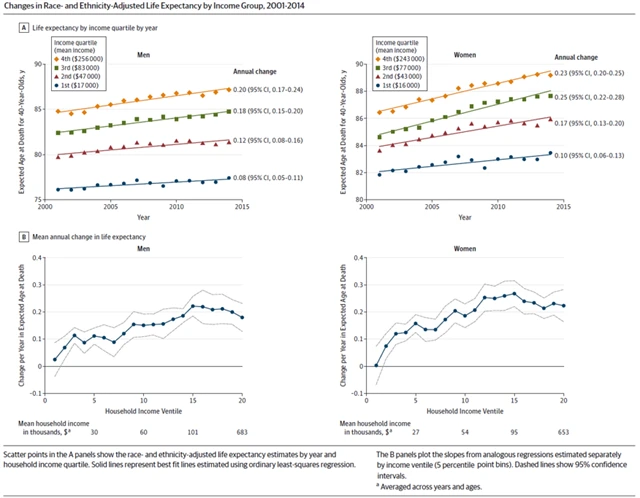 Mezi lety 2001 a 2014 se v USA průměrný věk dožití pěti procent mužů s nejvyššími příjmy zvýšil o 2,34 roku a pěti procent žen s nejvyššími příjmy o 2,91 roku, zatímco průměrný věk dožití pěti procent mužů a žen s nejnižšími příjmy se prodloužil jen nepatrně. Rozdíl mezi průměrným věkem dožití nejbohatšího a nejchudšího procenta mužů pak vzrostl na 14,6 roku a rozdíl mezi délkou dožití nejbohatšího a nejchudšího procenta žen se zvýšil na 10,1 roku.
