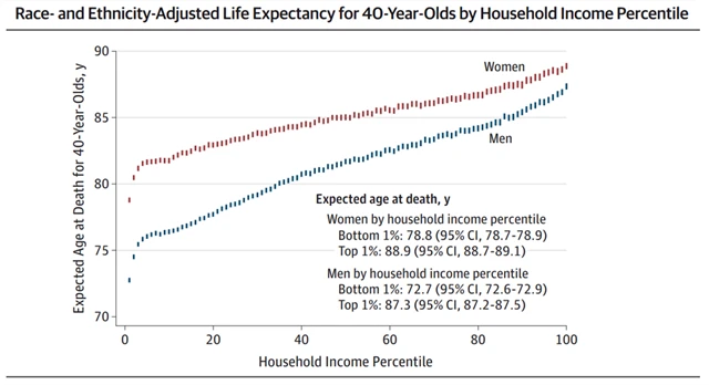 Pro odpůrce příjmové nerovnosti jde o další argument, proč by politici měli zintenzivnit boj proti rozevírání nůžek mezi chudými a bohatými. "Ukazuje se, že během pouhých 13 let lze lidský život prodloužit o dva až tři roky. To je úžasná zpráva. Teď je načase, aby to stejné bylo dopřáno i 95 % zbývajících lidí," říká John Mauldin, šéf konzultantské společnosti Mauldin Economics.