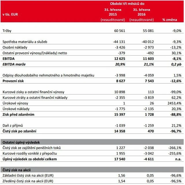Zisk EBIT činil v prvním čtvrtletí 7,5 milionu eur, ve srovnání s prvním čtvrtletím loňského roku byl tedy o 12,6 % nižší. EBITDA marže dosáhla 21,1 %, a oproti srovnatelnému období loňského roku tak vzrostla o 0,2 procentního bodu.