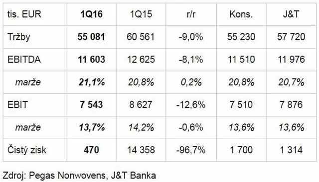 Výrobce netkaných textilií Pegas Nonwovens vykázal za letošní první čtvrtletí meziroční pokles tržeb o devět procent na 55,1 milionu eur. Negativně se na výsledku podepsal pokles cen polymerů, které se nyní nacházejí blízko dlouhodobých minim. Provozní zisk EBITDA společnosti klesl o 8,1 % na 11,6 milionu eur a čistý zisk se vlivem nerealizovaných kurzových změn propadl o 96,7 % na 470 tisíc eur.