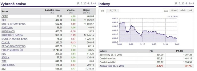 Index pražské burzy PX na počátku pátečního obchodování odepisoval 0,17 %. Nejvíce ztrácely Komerční banka a Unipetrol, naopak akcie CME mířily vzhůru.