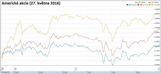Dow v pátek stoupl o 0,25 % na 17 873,22 bodu, širší S&P 500 zpevnil o 0,43 % na 2 099,06 bodu a Nasdaq Composite vzrostl o 0,65 % na 4 933,50 bodu. Index volatility VIX klesl o 2,31 % na 13,12 bodu a výnos 10letých vládních dluhopisů USA se zvýšil o dva bazické body na 1,851 %.